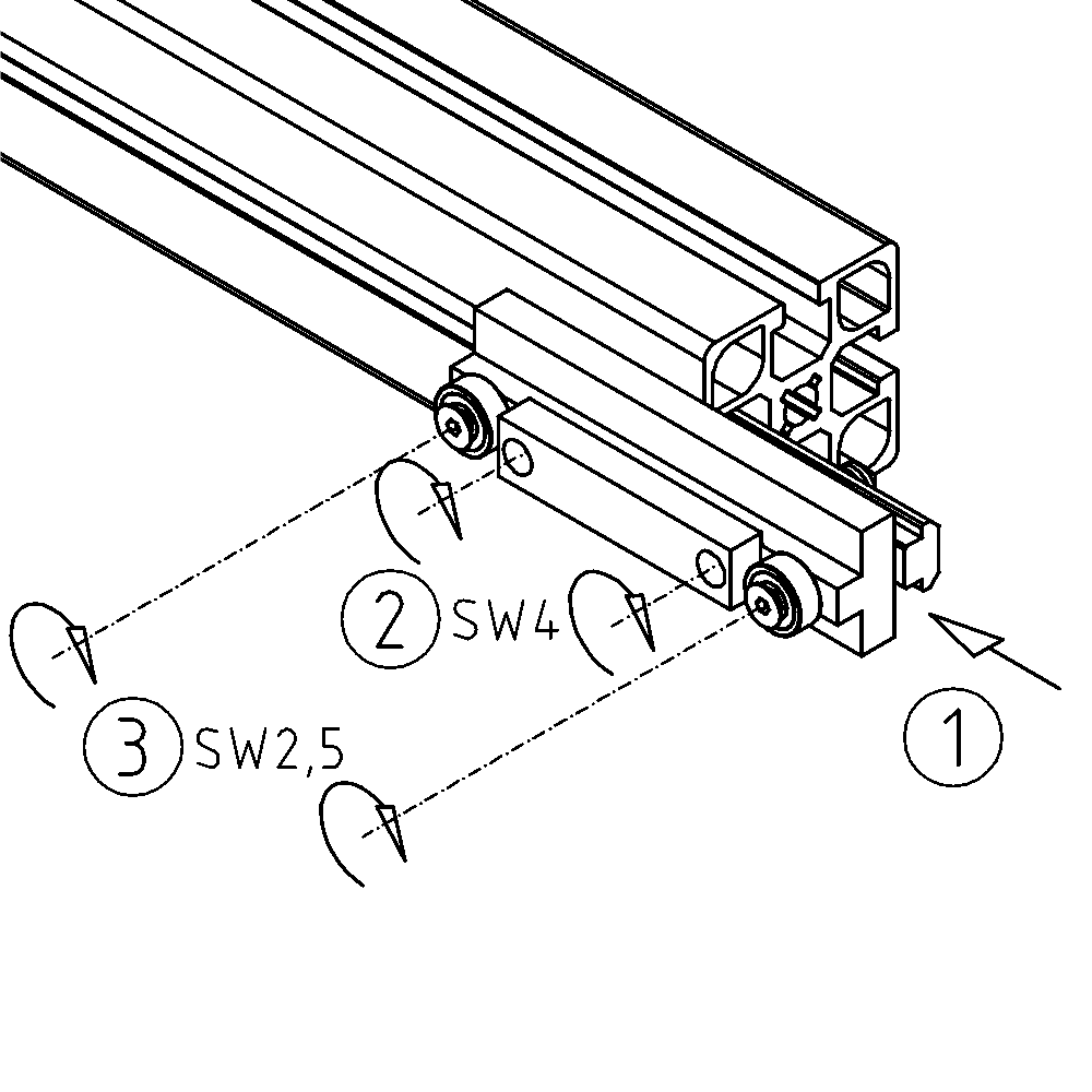 • 1. Vstavite predmontirani drsni valj v utor profila