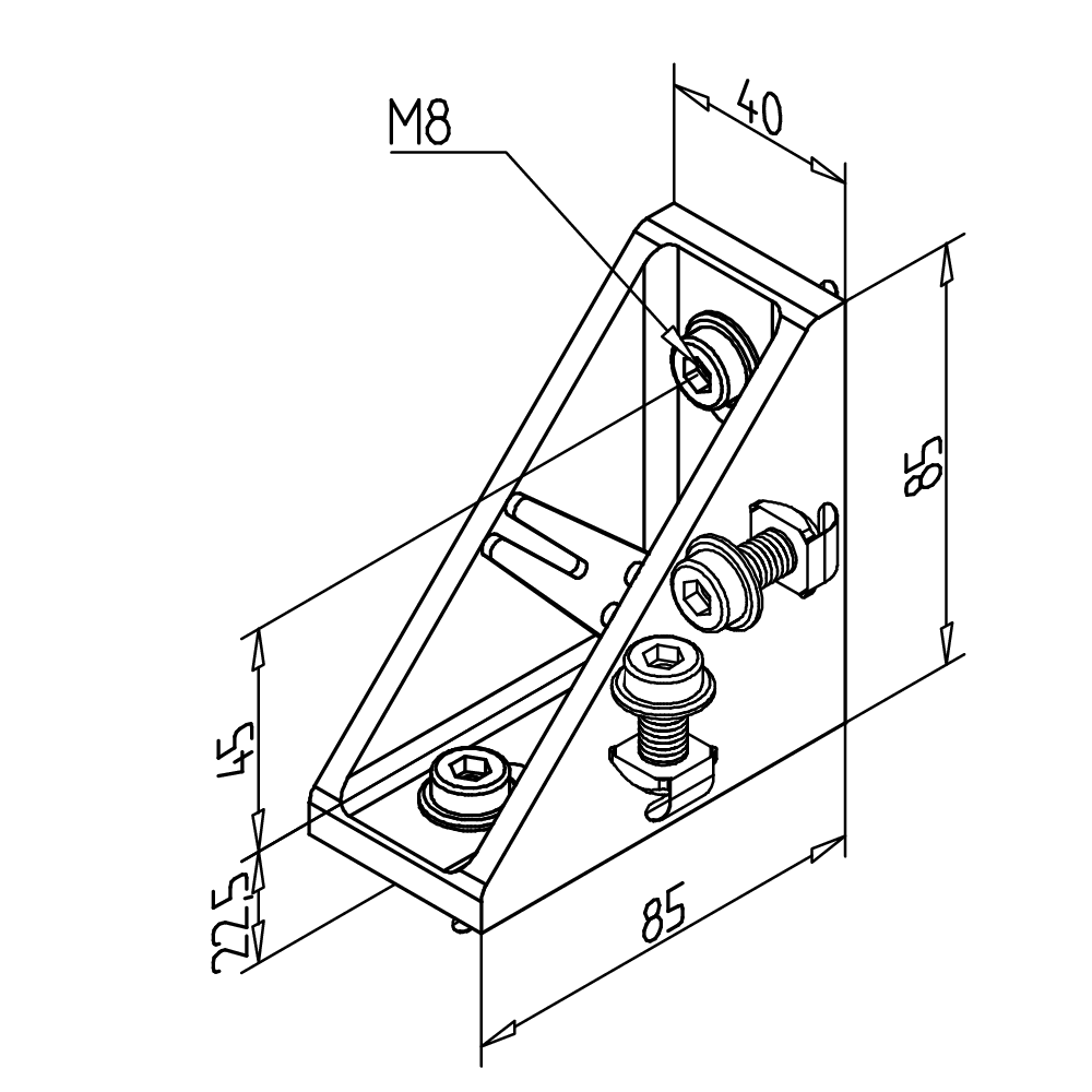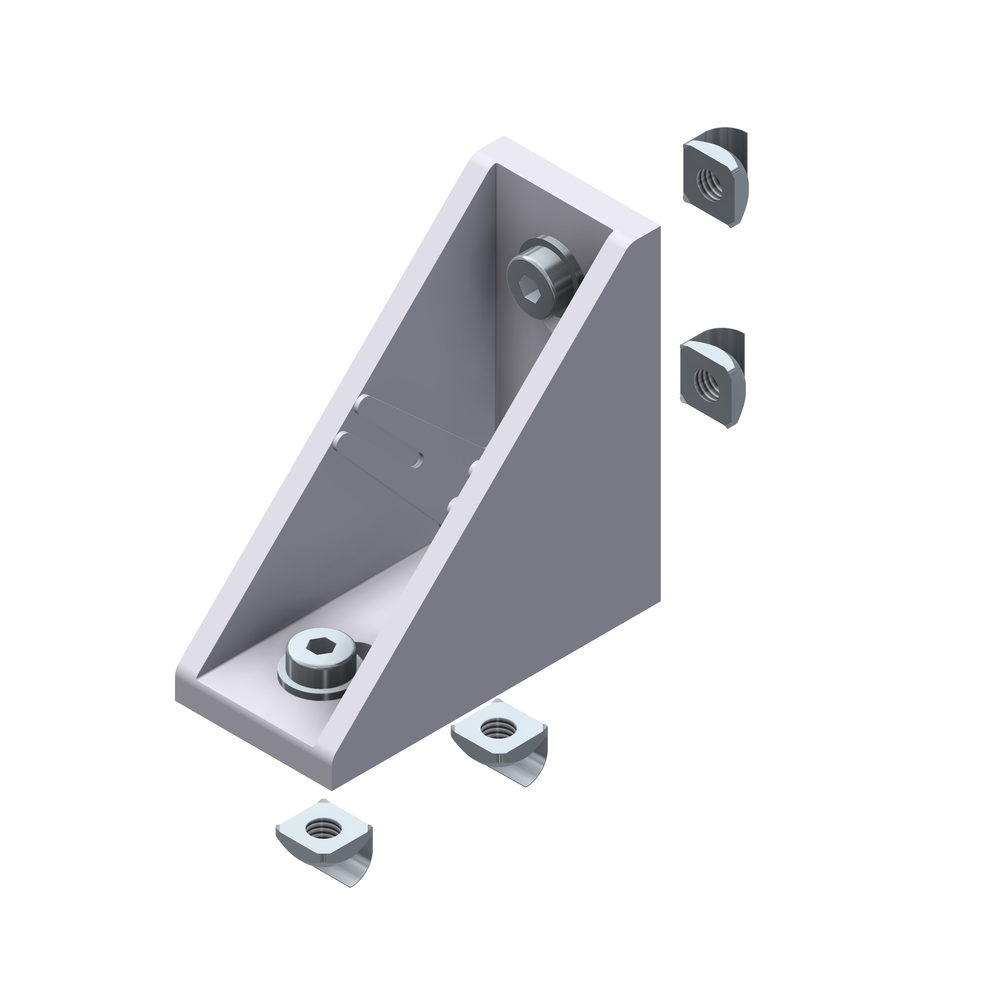 Prevodni alu kotnik 45 x 90 GD-Z z M8 kvadratno matico in pozicijskim fiksiranjem za enostavno montažo in natančno pozicioniranje brez dodatne obdelave. Povečuje stabilnost konstrukcije.
