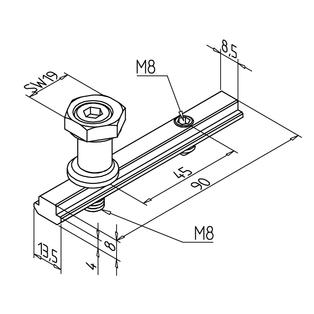 • Vstavite vijak M8 v ekscentrično pušo, že nameščeno v ležajno luknjo, in namestite podložko. Vijak predhodno privijte s šesterokotnim ključem SW4 na pritrdilni trak