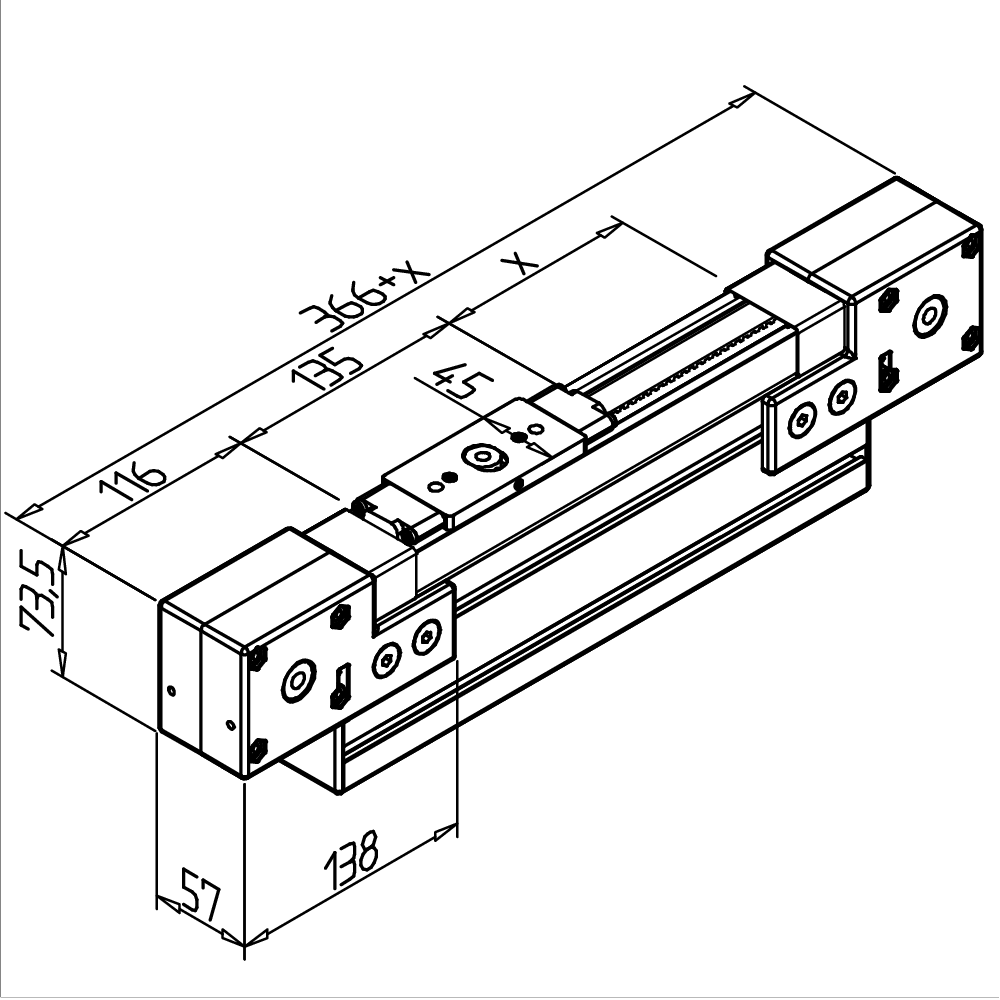 1x tirnica LR 6 z natančnimi jeklenimi gredmi h6, Ø 6 mm, na nosilnem profilu 45 x 90, 1x drsnik LW 6 Z z integriranim vodilom za zobati jermen, 2x kolesa za zobati jermen, 1x zobati jermen 16 AT 5, ojačan z jeklom