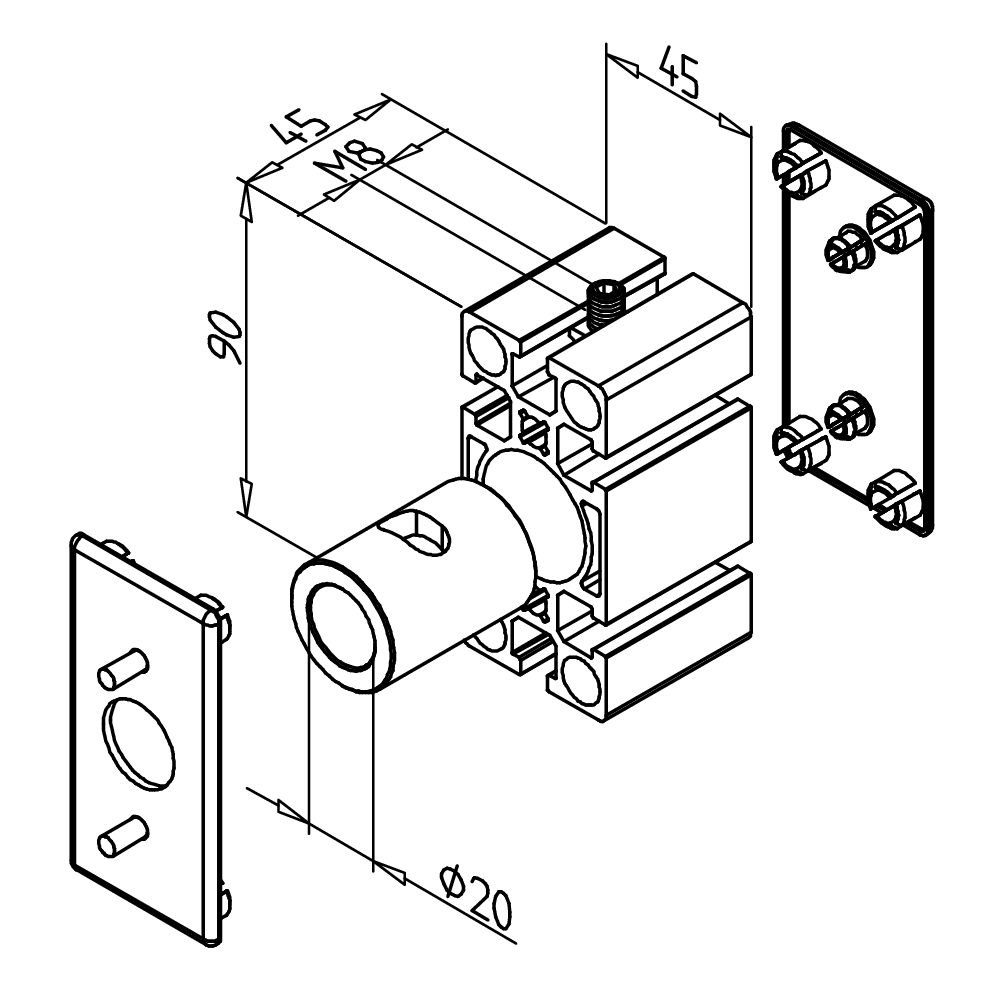 • Ležaj in pritrditev gredi Ø 20 mm v MiniTec linearnem sistemu LB 45