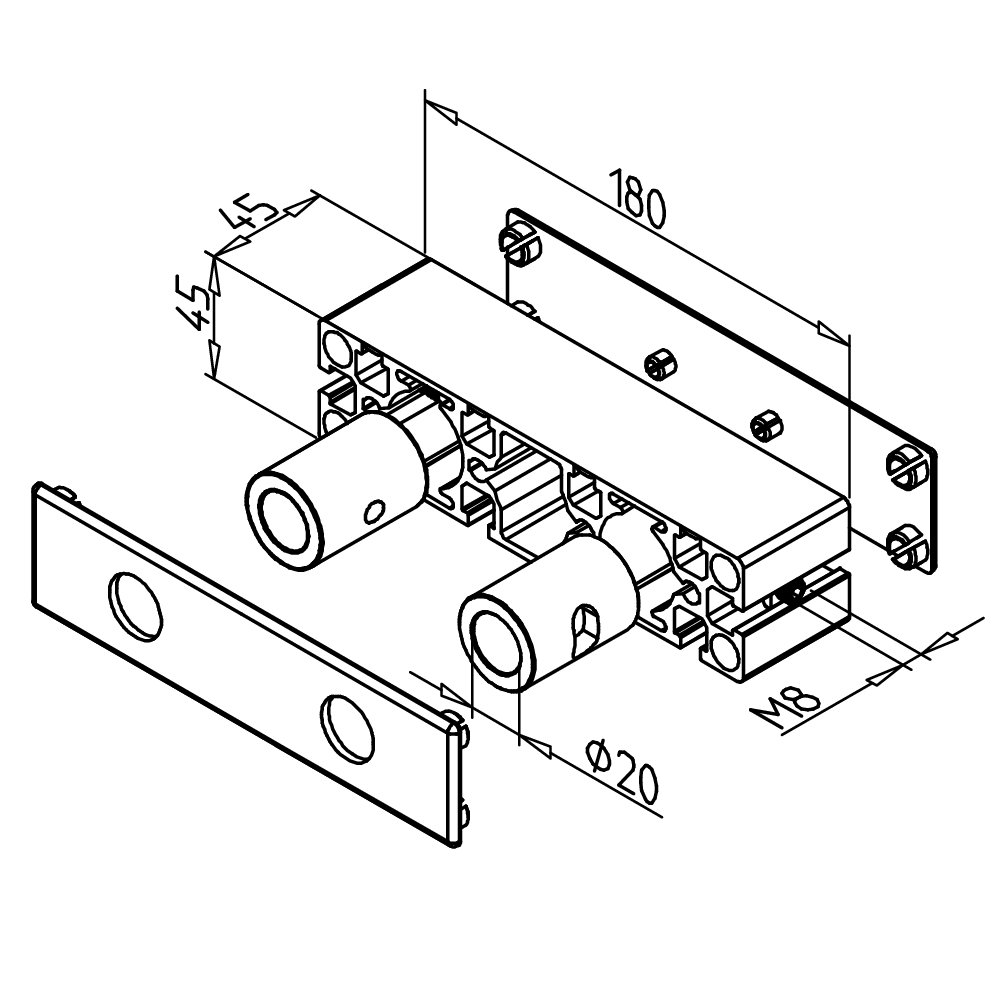 • Ležaj in pritrditev gredi Ø 20 mm v MiniTec linearnem sistemu LB 45 x 180