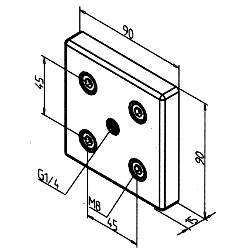 Pnevmatska osnovna plošča 90x90 z navojem G1/4" za enostavno pritrditev in povezavo pnevmatskih komponent v profilnih sistemih.