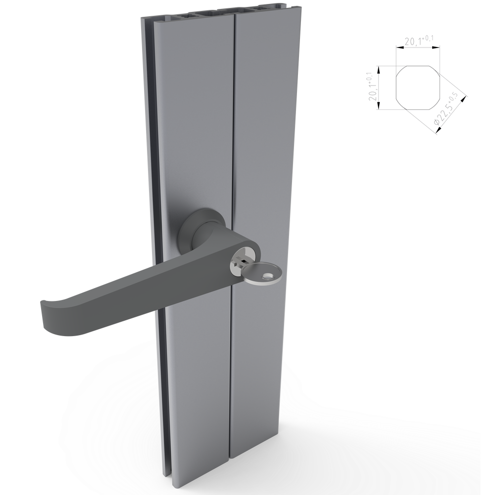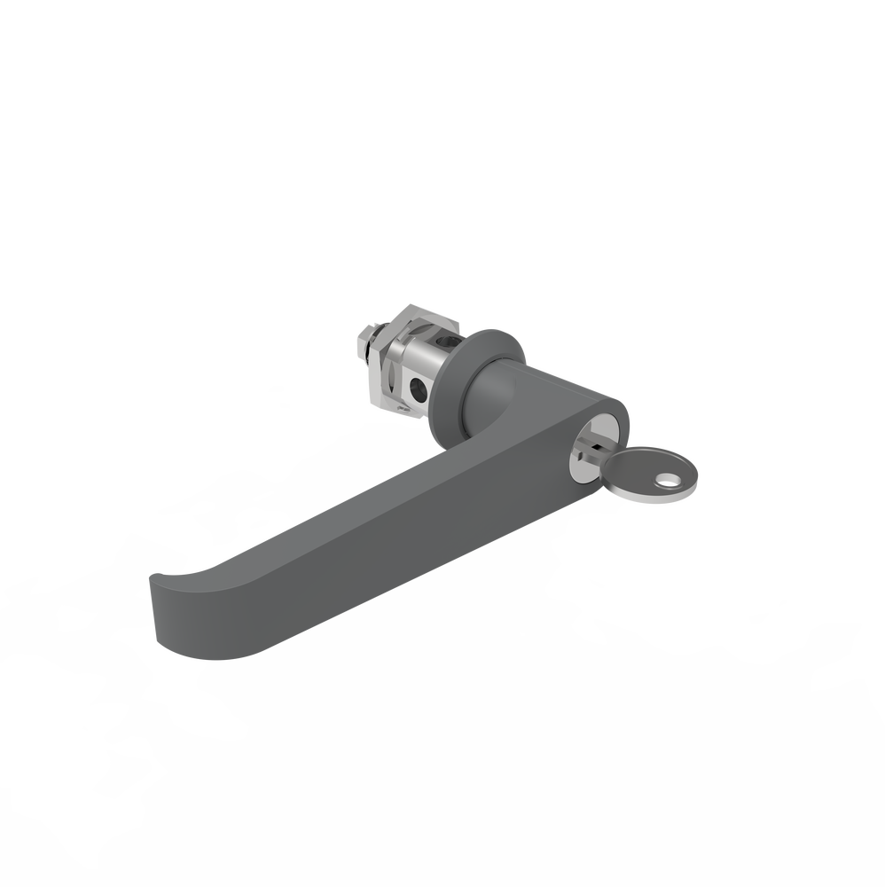 Ročaj za vrata 19 s ključavnico v sivi barvi za varno in zanesljivo zapiranje zaščitnih vrat in panelov v industrijskih okoljih.