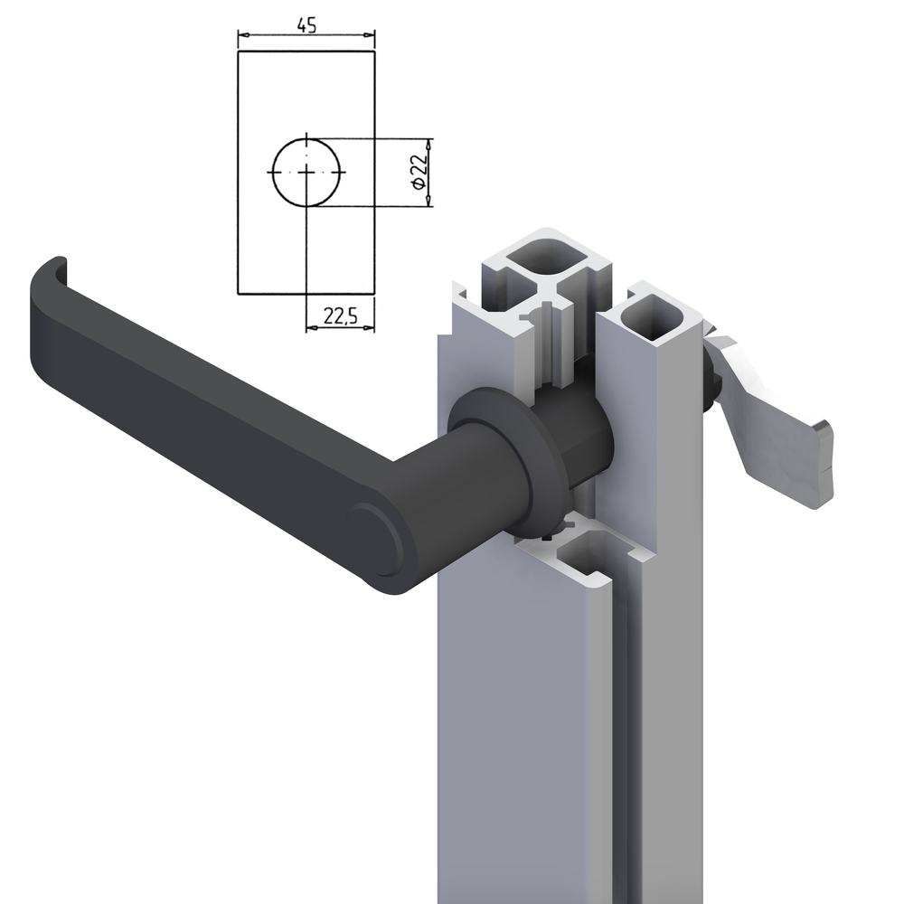Ročaj za vrata 32 v črni barvi za varno in zanesljivo zapiranje zaščitnih vrat in panelov v industrijskih okoljih.
