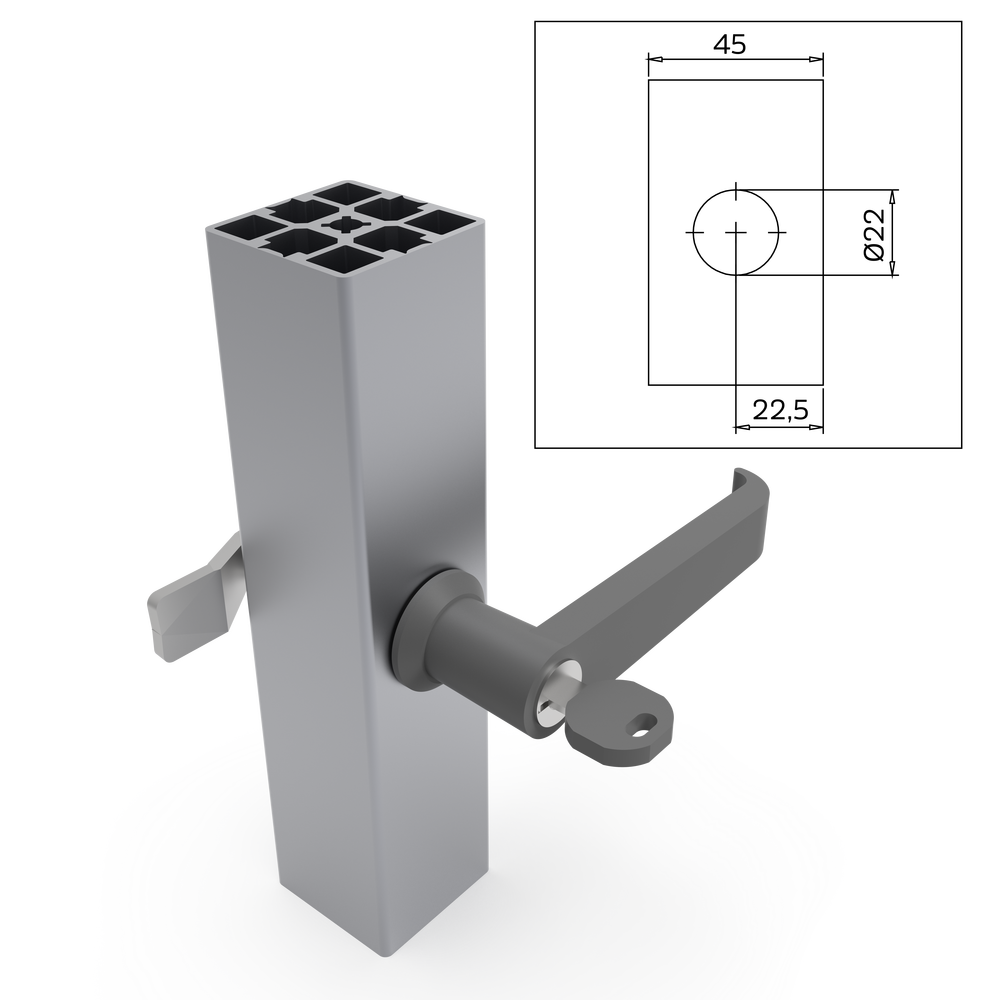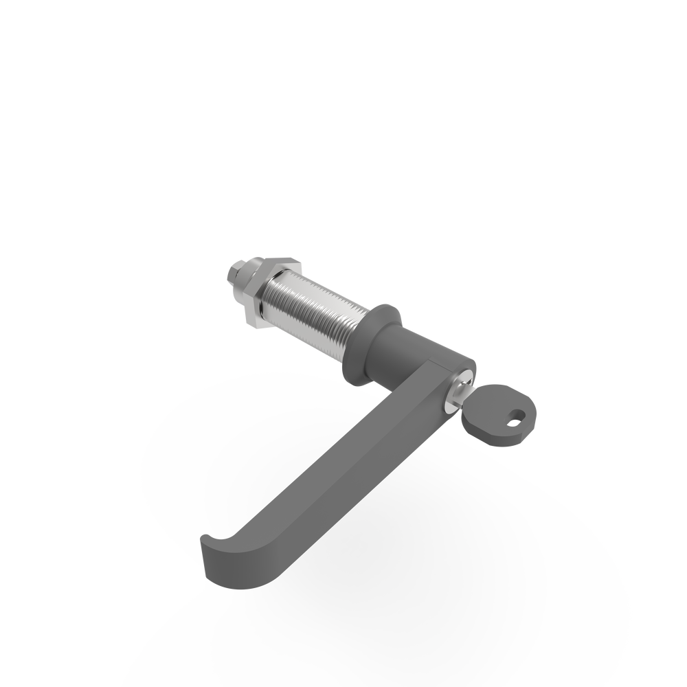 Ročaj za vrata 45 s ključavnico v sivi barvi za varno in zanesljivo zapiranje zaščitnih vrat in panelov v industrijskih okoljih.